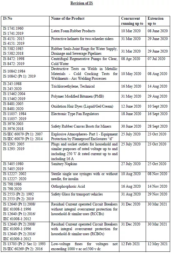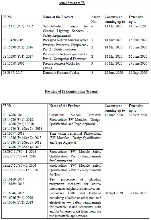 另外,印度中央標(biāo)準(zhǔn)局于2020年3月27日發(fā)布通知,由于受疫情影響, 將推后原本將于2020年3月1日及之后強(qiáng)制執(zhí)行的新版IS標(biāo)準(zhǔn),由原定執(zhí)行日期起推遲90天,詳情如下: