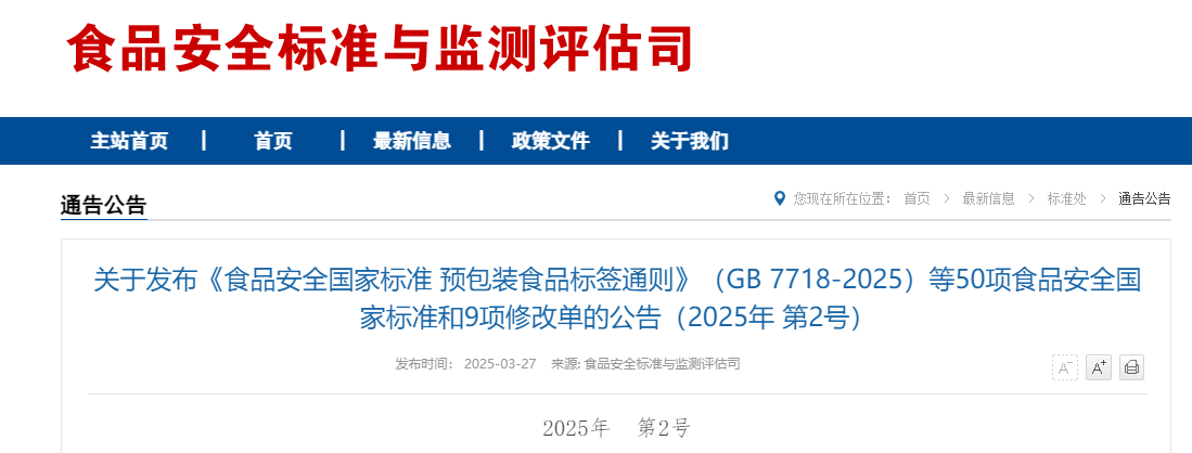 根據(jù)《食品安全法》規(guī)定,國家衛(wèi)生健康委、市場監(jiān)管總局聯(lián)合印發(fā)2025年第2號公告,發(fā)布50項(xiàng)新食品安全國家標(biāo)準(zhǔn)和9項(xiàng)修改單。主要包括:《預(yù)包裝食品標(biāo)簽通則》等2項(xiàng)食品標(biāo)簽標(biāo)準(zhǔn)、《嬰幼兒谷類輔助食品》等3項(xiàng)特殊膳食食品標(biāo)準(zhǔn)、《發(fā)酵乳》等4項(xiàng)食品產(chǎn)品標(biāo)準(zhǔn)、《調(diào)制肉制品生產(chǎn)衛(wèi)生規(guī)范》等3項(xiàng)生產(chǎn)經(jīng)營規(guī)范標(biāo)準(zhǔn)、《消毒劑》1項(xiàng)食品相關(guān)產(chǎn)品標(biāo)準(zhǔn)、《食品營養(yǎng)強(qiáng)化劑?乙二胺四乙酸鐵鈉》等4項(xiàng)食品營養(yǎng)強(qiáng)化劑質(zhì)量規(guī)格標(biāo)準(zhǔn)、《食品添加劑?葉黃素》等4項(xiàng)食品添加劑質(zhì)量規(guī)格標(biāo)準(zhǔn)、《食品安全國家標(biāo)準(zhǔn) 食品微生物學(xué)檢驗(yàn) 大腸菌群計(jì)數(shù)》等29項(xiàng)檢驗(yàn)方法標(biāo)準(zhǔn),以及《滅菌乳》等9項(xiàng)修改單。
