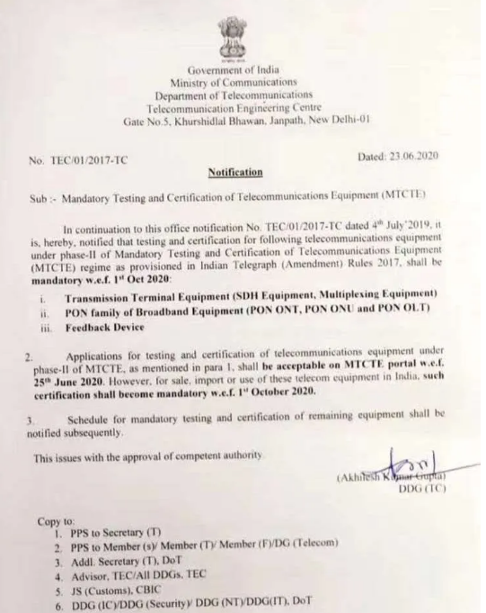2020年6月中旬,印度電信工程中心(TEC)再次修訂了有關(guān)電信設(shè)備強(qiáng)制性測(cè)試和認(rèn)證(MTCTE)程序,此次修訂放松了MTCTE程序中認(rèn)證產(chǎn)品標(biāo)簽的要求。根據(jù)公告內(nèi)容,加貼標(biāo)簽的強(qiáng)制要求可以延期至2021年4月1日,即從2020年10月1日算起,過(guò)渡期6個(gè)月。