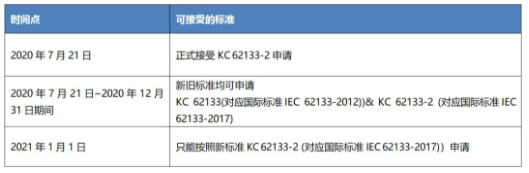 2020年7月21日,韓國技術(shù)標(biāo)準(zhǔn)局KATS(Korean Agency for Technology and Standards)發(fā)布新通知:KC 62133-2 正式確認(rèn)并開始使用。其對(duì)應(yīng)的國際標(biāo)準(zhǔn)IEC 62133-2012版和IEC 62133-2017版的CB報(bào)告及證書在2020年12月31前均可以被接受用于KC轉(zhuǎn)證。具體時(shí)間點(diǎn):
