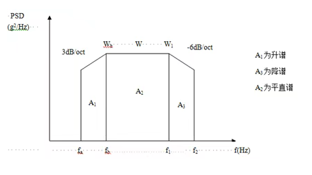 為了簡便起見,往往將功率譜密度曲線圖劃分成若干矩形和三角形,并利用上升斜率(如3dB/oct)和下降斜率(如-6dB/oct)分別算出wa 和w2,然后求各個幾何形狀的面積與面積和,再開方求出加速度總均方根值。