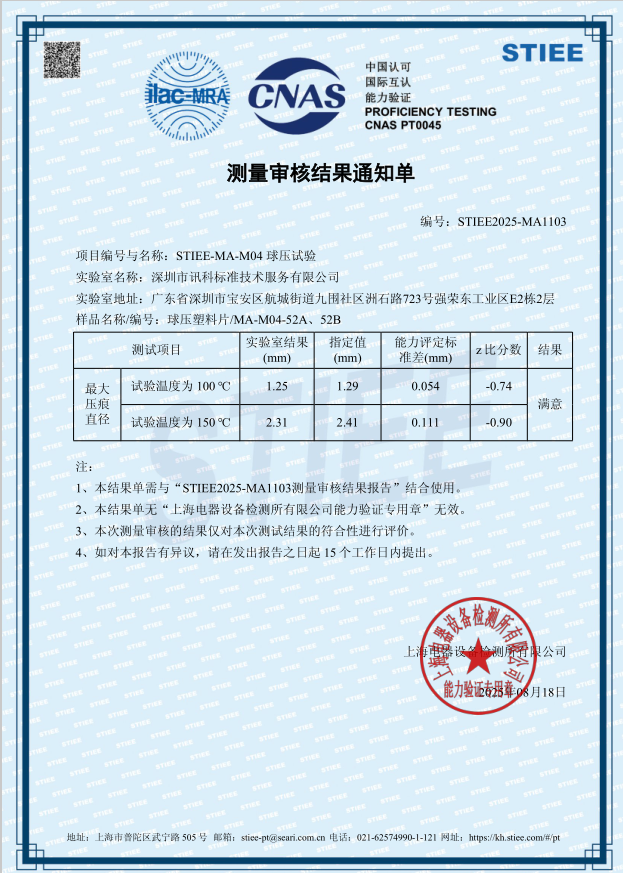 我司STIEE-MA-M04 球壓試驗?zāi)芰︱炞C圓滿通過,我們秉承科學(xué)嚴(yán)謹(jǐn)?shù)墓ぷ鲬B(tài)度,以客戶為中心,高效統(tǒng)籌安排測試計劃,竭力縮短測試時間的周期,為客戶提供快捷、公正的第三方咨詢檢測等服務(wù)。服務(wù)區(qū)域遍布廣東廣州、深圳、東莞、佛山、中山、珠海、清遠(yuǎn)、惠州、茂名、揭陽、梅州、江門、肇慶、汕頭、潮州、河源、韶關(guān)及全國各地如您有相關(guān)產(chǎn)品需要咨詢,歡迎您直接來電咨詢我司工作人員,獲得詳細(xì)的費用報價與周期方案等信息,深圳訊科期待您的光臨!