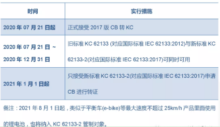 鋰電池產(chǎn)品的韓國KC認(rèn)證可以接受CB報(bào)告及證書轉(zhuǎn)證,2020年12月31日前IEC 62133:2012版和IEC 62133:2017版的CB報(bào)告及證書(CB報(bào)告及證書需額外增加KC 62133-2國家差異的評(píng)估)均可以被接受用于KC轉(zhuǎn)證。2021年1月1日起只接受新標(biāo)準(zhǔn)KC 62133-2進(jìn)行轉(zhuǎn)證。具體時(shí)間安排如下: