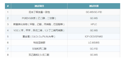 針對電子煙釋放物(Emission)有害成分分析,采用客戶廣泛接受的國際標準,率先開發(fā)出了一整套完善的測試方案,可為客戶提供以下測試服務(wù):