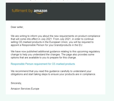 在這之前,產(chǎn)品只需做完CE認證,就會覺得萬事大吉了。不過現(xiàn)在,歐盟已有新的規(guī)則出來了:對于銷售帶有 CE 標志的商品,亞馬遜強調(diào),必須要在 2021 年 7 月 16 號之前,確保具有位于歐盟的負責人(簡稱歐代)。
