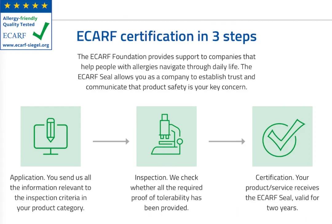 頒發(fā)的ECARF質(zhì)量標(biāo)志的防過(guò)敏產(chǎn)品,需符合嚴(yán)格的檢測(cè)標(biāo)準(zhǔn)。為了獲得認(rèn)證,制造商必須披露所有的原材料和配方。
