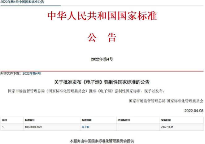 2022年4月12日,國(guó)家市場(chǎng)監(jiān)督管理總局(國(guó)家標(biāo)準(zhǔn)化管理委員會(huì))批準(zhǔn)《電子煙》強(qiáng)制性國(guó)家標(biāo)準(zhǔn),標(biāo)準(zhǔn)編號(hào)為GB41700-2022,由2022年10月1日起實(shí)施。