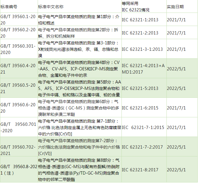 國家市場監(jiān)督管理總局(國家標準化管理委員會)分別于2020年12月14日和2021年10月11日分兩個批次批準并發(fā)布了電子電氣產(chǎn)品中某些物質的測定GB/T 39560系列標準共計9個標準。針對XRF篩選測試、聚合物中多溴聯(lián)苯和多溴二苯醚以及鍍層中六價鉻的測試標準已于2021年7月1日正式實施,而對聚合物、金屬和電子件中的鉛、鎘、汞、鉻以及聚合物和電子件中六價鉻、聚合物中鄰苯二甲酸酯的測試標準將于2022年5月1日正式實施。