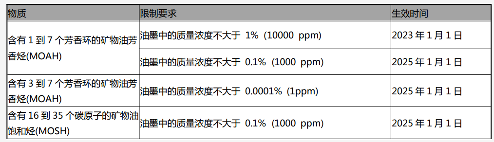 (2)在每個(gè)截止日期前制造或進(jìn)口的紙質(zhì)包裝和印刷品,如果符合在這些截止日期之前的含量要求,將有自這些截止日期起12個(gè)月的庫存處理期。就本法令而言,礦物油是指從用于制造油墨的石油烴衍生的原料生產(chǎn)的油。礦物油作為復(fù)雜的碳?xì)浠衔?,主要包括直鏈、支鏈烷烴和烷基取代的環(huán)烷烴(MOSH)以及烷基取代的芳香烴(MOAH)兩大類。通過飲食攝入人體內(nèi)的礦物油易在人體內(nèi)發(fā)生集聚,給人體健康帶來巨大的損害。2017年10月27日,世界衛(wèi)生組織國際癌癥研究機(jī)構(gòu)公布的致癌物清單中,將未經(jīng)處理或輕度處理的礦物油列入1類致癌物清單,礦物油、高精煉油在3類致癌物清單